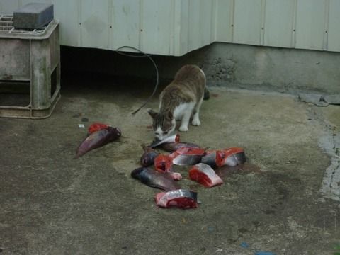 漁師さんからこんなに沢山のお魚をもらってるにゃんこちゃんの姿